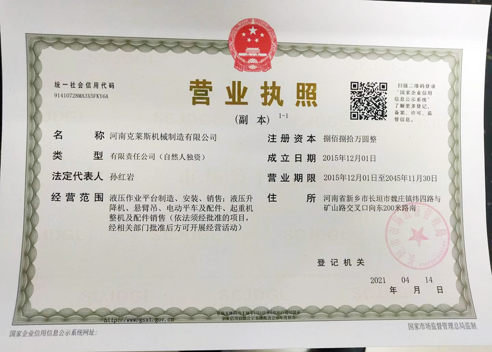 河南克萊斯機(jī)械制造有限公司位于河南省長(zhǎng)垣市魏莊工業(yè)園區(qū),公司注冊(cè)資金捌佰捌拾萬(wàn)元整,在職員工40余名,擁有研發(fā)設(shè)計(jì)團(tuán)隊(duì),是一家生產(chǎn)液壓升降作業(yè)平臺(tái)及旋臂起重機(jī)生產(chǎn)銷(xiāo)售的廠(chǎng)家。  公司主要產(chǎn)品有:固定導(dǎo)軌式液壓升降作業(yè)平臺(tái)、移動(dòng)式液壓升降平臺(tái)、車(chē)載式液壓升降平臺(tái);定柱式懸臂吊、墻壁吊、電動(dòng)平車(chē)、登車(chē)橋等?! 【嫉脑O(shè)備,嚴(yán)格的管理是公司得以不斷發(fā)展壯大、產(chǎn)品能夠贏(yíng)得用戶(hù)依賴(lài)的根本所在。  “精確、...... <了解更多>